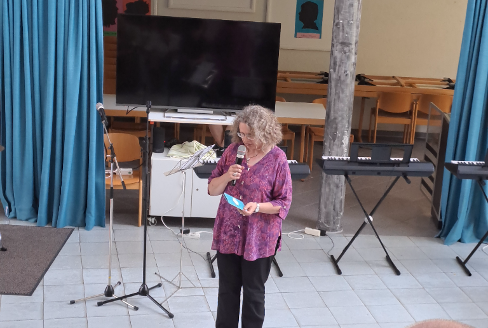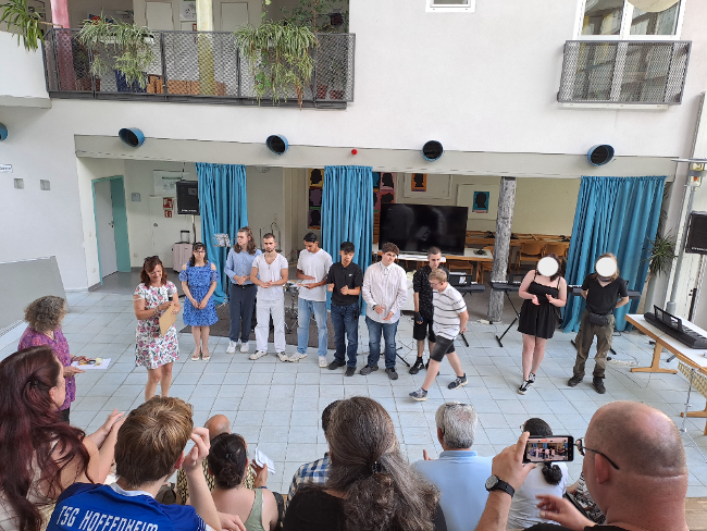Die Schulleiterin Frau Soerensen bereichterte die SBFW-Feier mit einer inspirierenden Rede zum Thema Menschlichkeit. Sie hob hervor, wie wichtig es sei, in unserer heutigen Gesellschaft menschlich und mitfühlend zu handeln. Die Schülerinnen und Schüler sorgten mit verschiedenen Spielen und Aktivitäten für viel Spaß und Lachen. Ein Highlight war das Spiel "Gesichter erkennen", bei dem das Publikum die vom Schüler Leonardo Kamberowski gezeichneten Bilder von Mitschüler*innen und Lehrkäften durch teilweises Aufdecken erraten mussten. Auch ein Quiz, bei dem das Wissen der Lehrkräfte über die Schüler*innen auf die Probe gestellt wurde, sorgte für gute Stimmung und regte teilweise auch zum Nachdenken an. Musikalisch wurden die Feiern von einem Musikbeitrag des VAB und einem Song, perfomt von Marek Firmanti, untermalt.