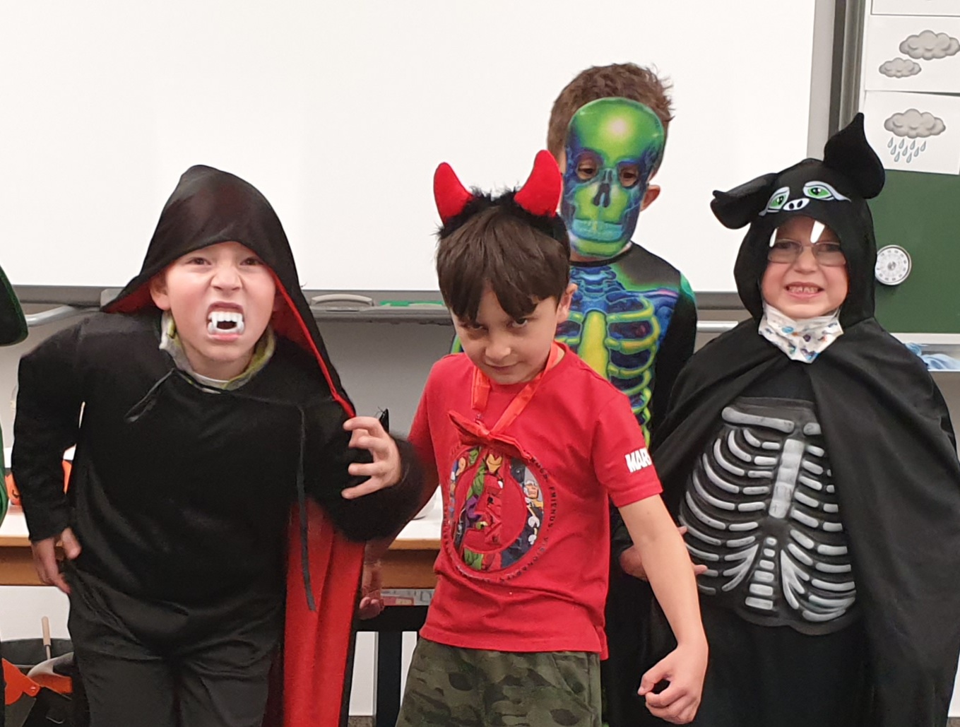 Am Tag der Halloweenparty waren die Klassenzimmer mit Fledermäusen, Gespenstern, Luftballons und Girlanden geschmückt. Die Kinder sind verkleidet in die Schule gekommen. Es gab viele verschiedene Kostüme: Vampire, Zombies, Skelette, Teufel und vieles mehr. Wer von der Halloweenparty nichts wusste, hat sich beim Anblick der gruseligen Kinder auf den Fluren ganz schön erschreckt.