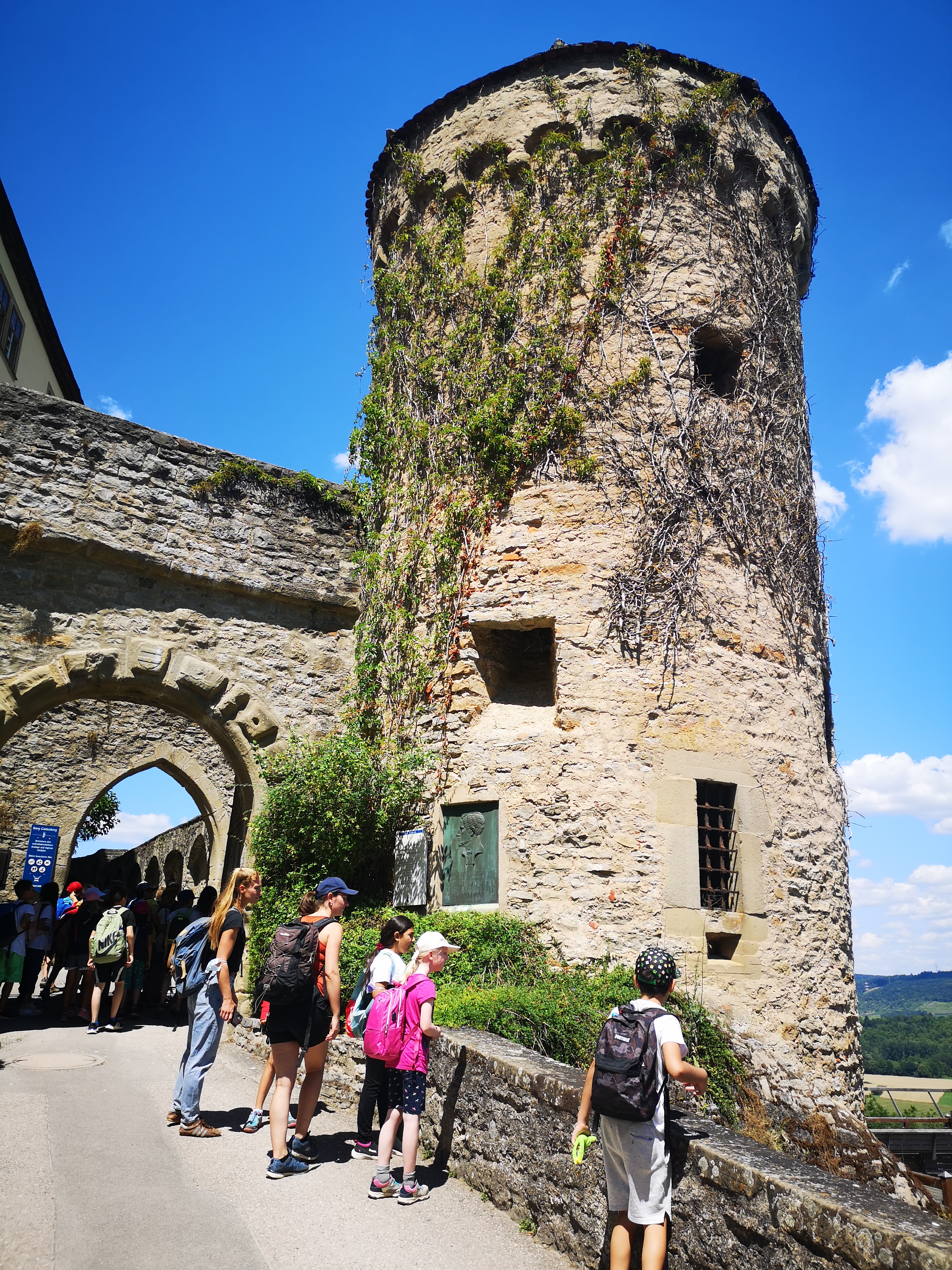 Am zweiten Tag hatten wir zum Frühstück Kakao und ein Marmeladen- oder Aprikosenbrötchen. Es gab auch Käse und Müsli. Als das Frühstück fertig war, sind wir mit dem Zug zur Burg Guttenberg gefahren. Wir mussten vom Bahnhof zur Burg laufen. Als wir angekommen sind, haben die Lehrerinnen uns gefragt, ob wir Eis haben wollen. Natürlich sind alle Kinder los gerannt. Das Eis war lecker!