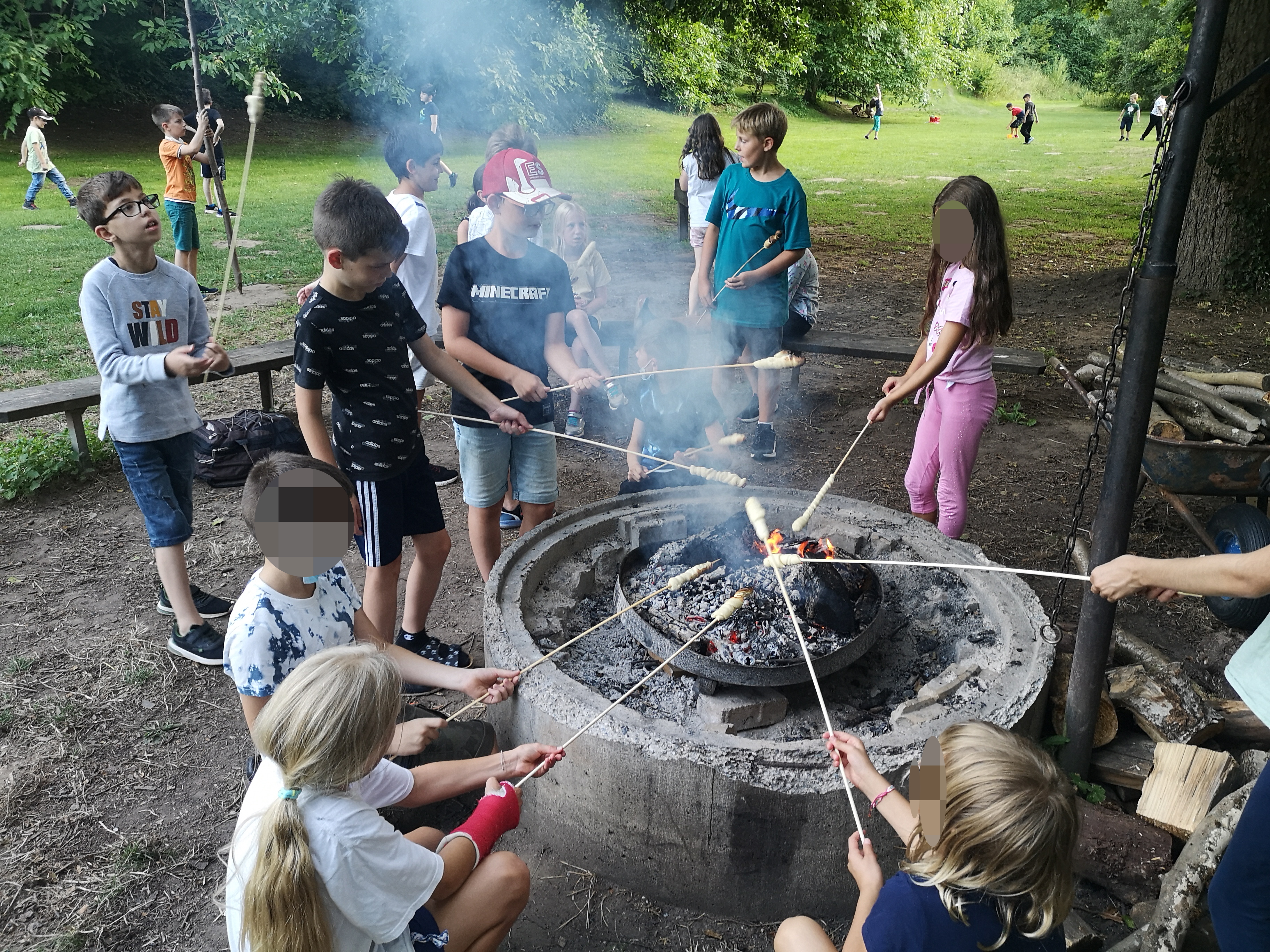 Zum Mittagessen gab es Lunchpakete von der Schule. Mittags haben wir in kleinen Gruppen eine Wiesenrallye gemacht. Jede Gruppe hat sich einen coolen Namen gegeben. Zum Abendessen gab es Nudeln mit Gemüsesoße. Danach gab es Stockbrot über dem Lagerfeuer. Wer wollte, konnte Kräuter auf sein Stockbrot machen. Zum Schluss haben wir in unser Tagebuch geschrieben, was wir gemacht haben und sind ins Bett gegangen.