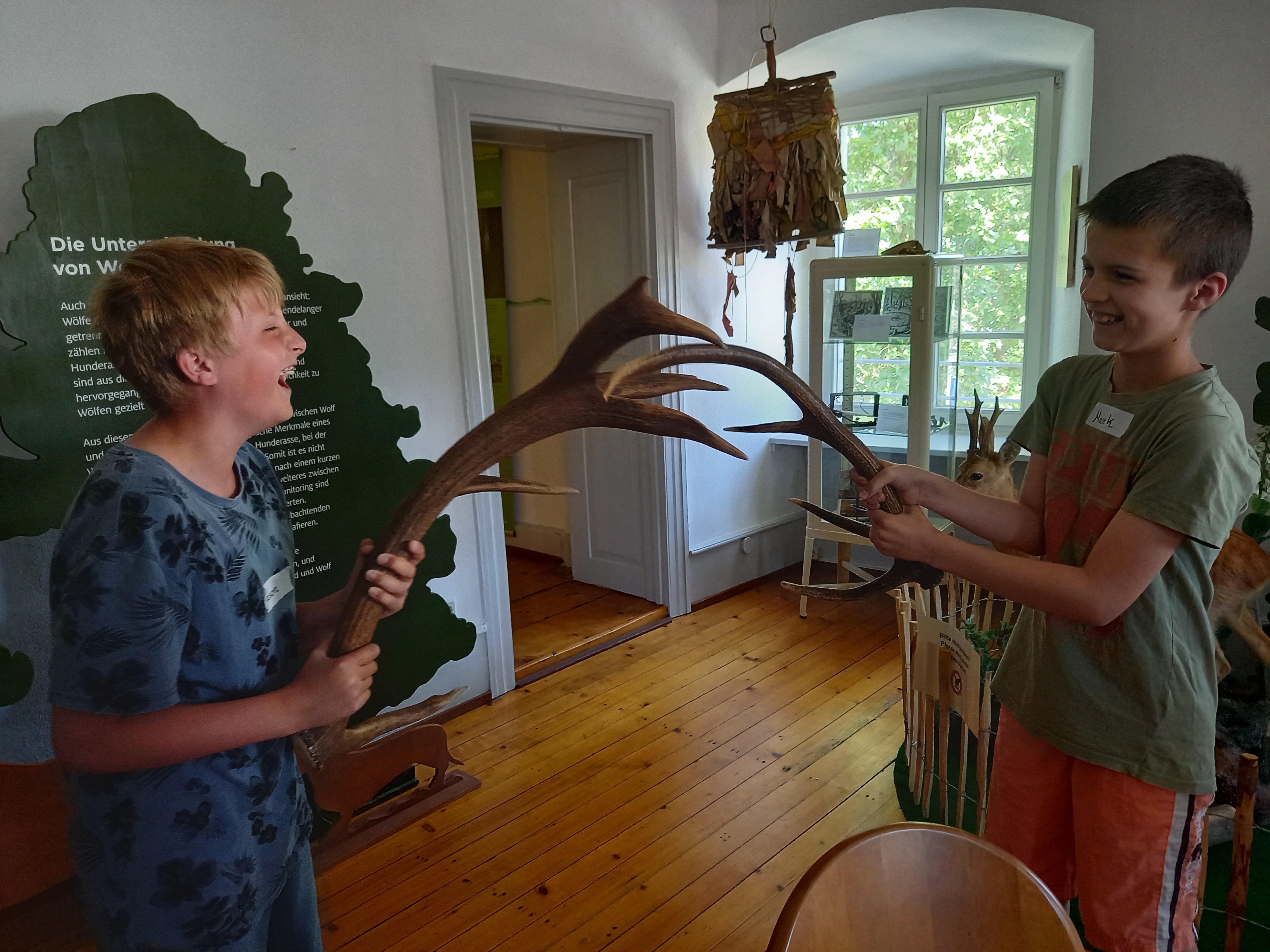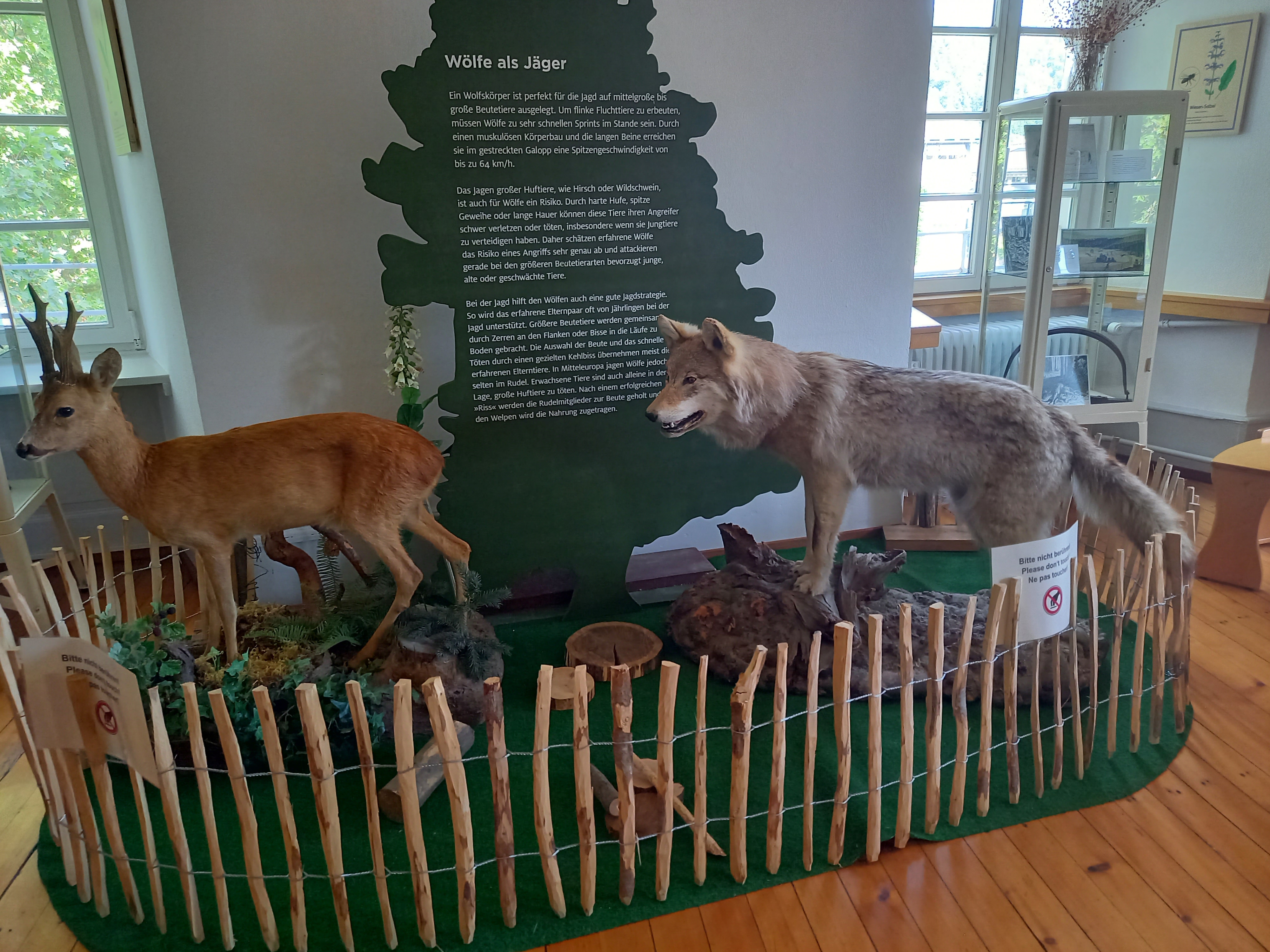 Wir haben ausgestopfte Wölfe gesehen und erfahren, dass die Wölfe nicht an jedem Tag Fleisch fressen. Heute sind die Wölfe sehr scheu und haben Angst vor Menschen.