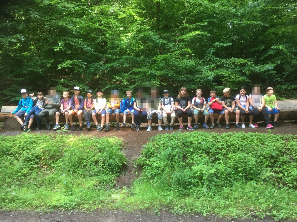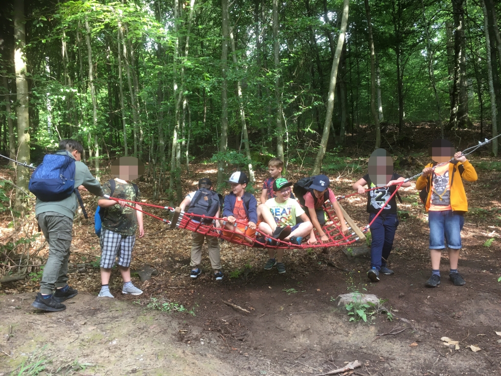 Wir mussten eine Stunde durch den Wald laufen. Dort waren Stationen: Ein Wald-Xylophon, eine Hängematte, ein Parcours.