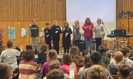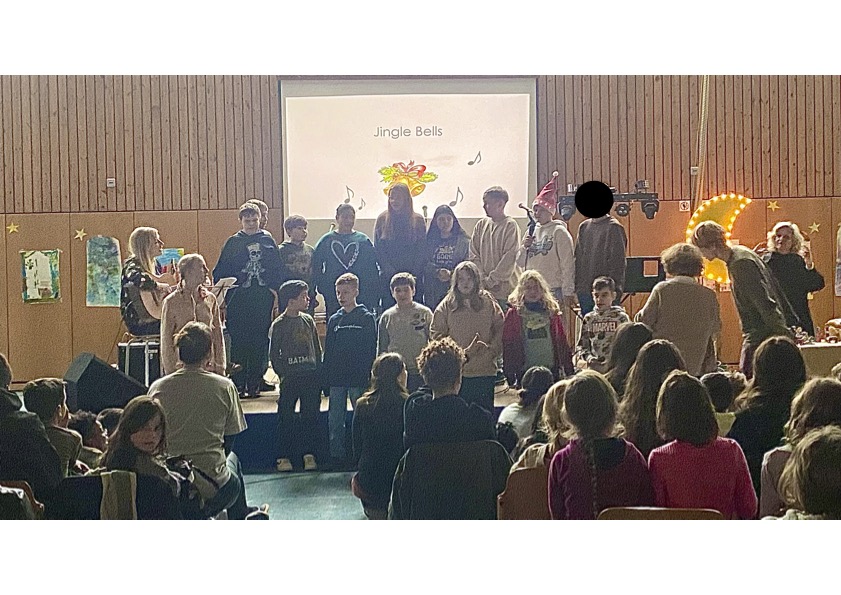 Danach sang eine  der sechsten Klassen zusammen mit Schülerinnen und Schülern der Klasse drei das Lied Jingle Bells. Alle stimmten ein!