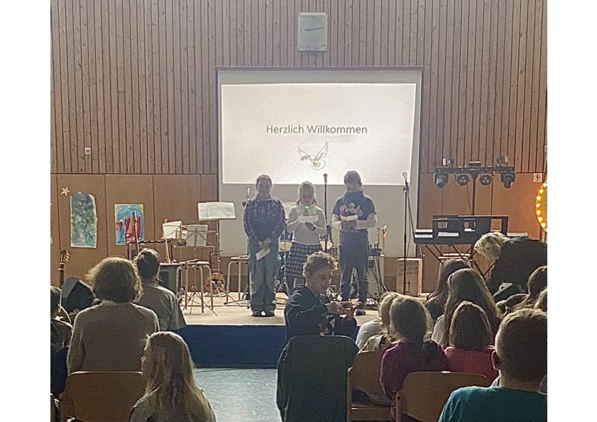 Die Andacht begann mit einer Begrüßung durch drei Schülerinnen und Schüler der Klasse vier.