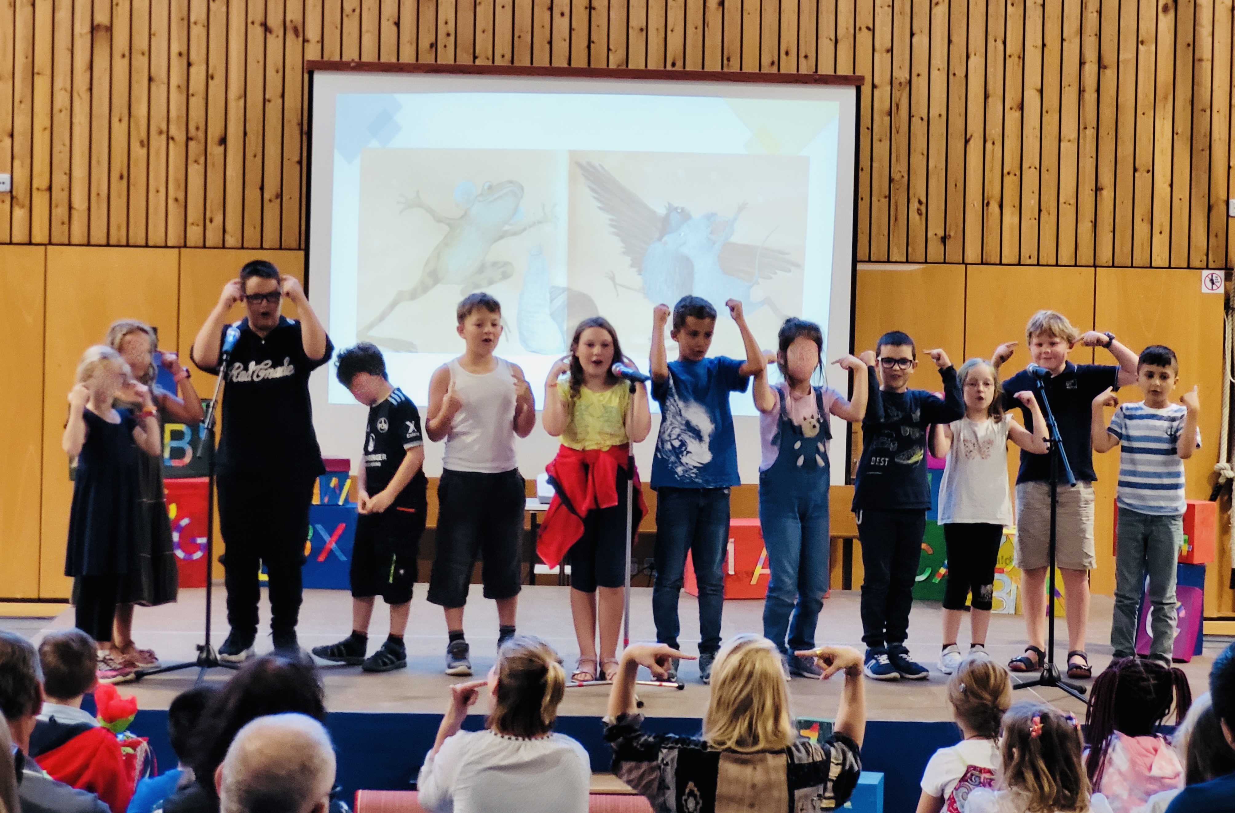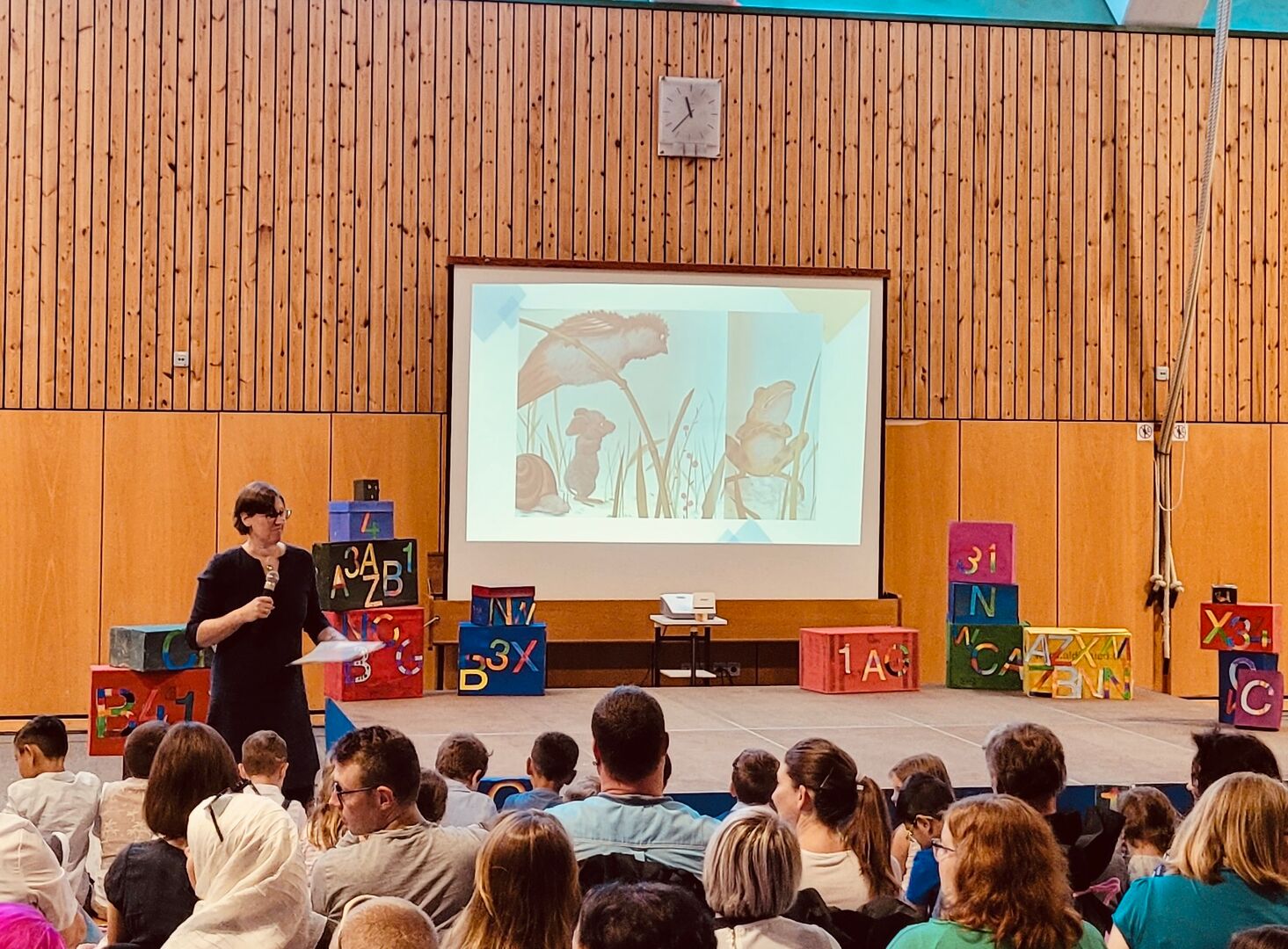 Danach kamen sie so mutig wie ihre Klassentiere auf die Bühne, um mit ihren Lehrkräften und Erzieherinnen das Klassenzimmer anzuschauen und die erste Schulstunde zu erleben.