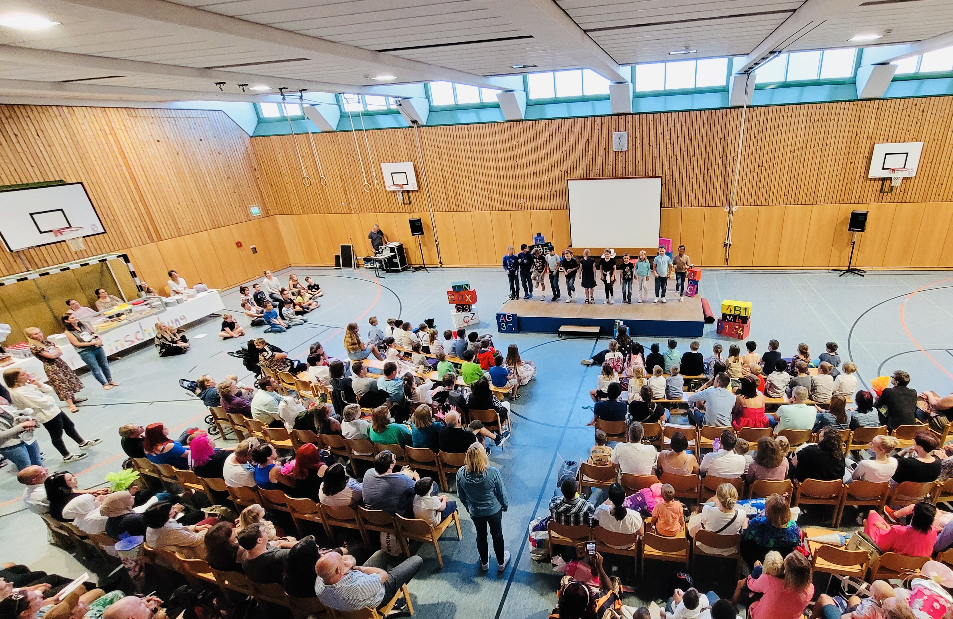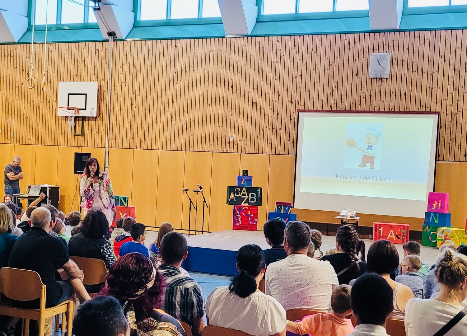 Unsere neuen Schülerinnen und Schüler wurden in der großen Turnhalle bei der Einschulungsfeier begrüßt. Die dritten Klassen zeigten auf der Bühne einen kleinen Teil von dem, was sie schon alles gelernt haben. Bei den Reden von Frau Soerensen und Frau Helbig bewiesen die neuen Schulkinder dann, dass sie schon jede Menge über Berufe und Tiere wissen.