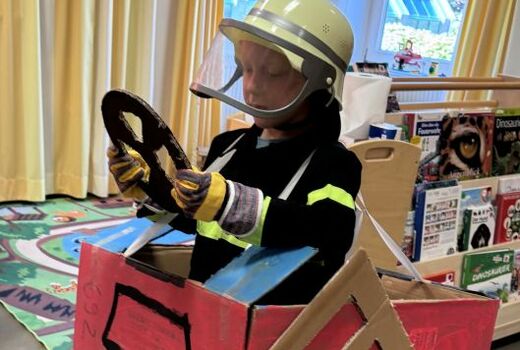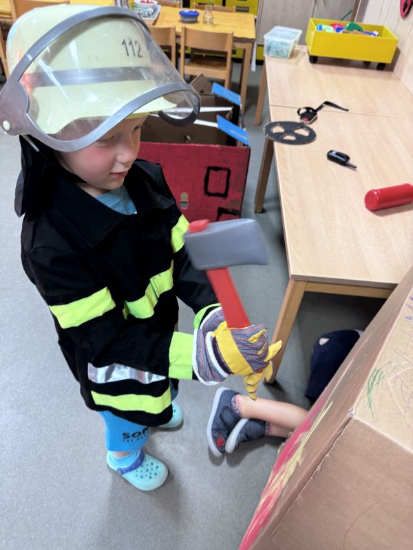 Später auch ein „Brand“ im Spielkartonhaus: zuerst wurde die Feuerwehrausrüstung angezogen, dann unter 112 der Notruf gewählt! Als geklärt wurde, wo sich der Brand befindet, eilten die Feuerwehrkinder mit dem Feuerwehrauto zum Brand. Unter vollem Einsatz wurde gelöscht, befreit und sogar Menschen aus dem Feuer gezogen und gerettet! Nach so einer Vorbereitung kann der Besuch bei der „richtigen“ Feuerwehr kommen.