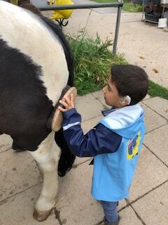 Die Kinder bekamen bei einem kleinen Rundgang einen Einblick in die vor Ort lebende Tiervielfalt: Katzen, Hühner, Schafe, Hunde und im Besonderen die Pferde. Nach anfänglichem Zögern wurde jedes Kind mutig und streichelte ein Schaf, fütterte die Hühner oder striegelte ein Pferd. Langeweile kam nie auf und das Wichtigste an diesem ganzen Projekt: Die Sprache, sie kam ganz von allein! Die Kinder kommunizierten ohne Hemmungen und loteten ihre Grenzen neu aus. Das Anfassen, Begreifen und die Bewegung von Tier und Mensch löste so viele direkte Impulse in jedem einzelnen Kind aus, dass das Bedürfnis, sich in Lautsprache oder in Gebärden auszudrücken ganz selbstverständlich entstand.