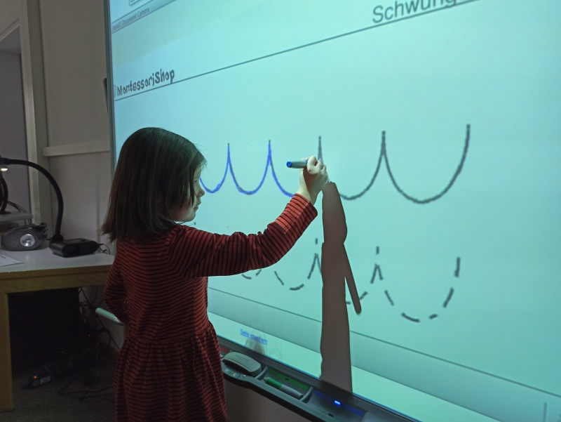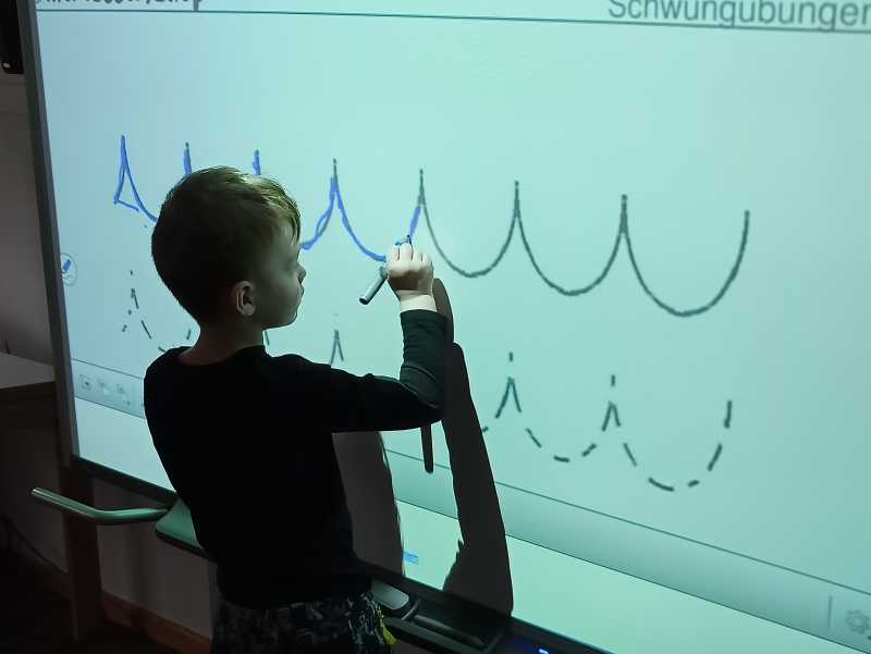 Neben der Touchfunktion kann außerdem mit kabellosen Stiften auf die interaktive Tafel geschrieben werden. Die Vorschulkinder üben das korrekte Schreiben erster Buchstaben und auch schon für die Kleinsten sind graphomotorische Übungen möglich.