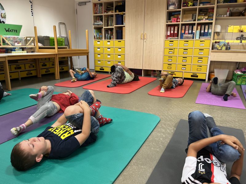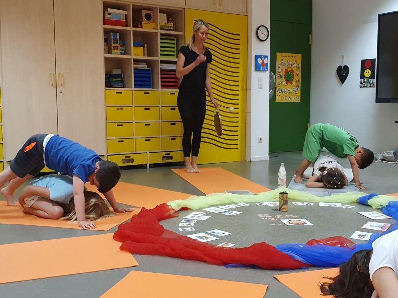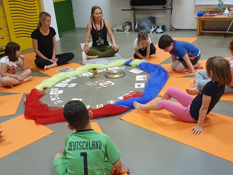 Endlich konnten die Kinder des Schulkindergartens eine Woche lang nach Herzenslust ihrer Lieblingsbeschäftigung nachgehen und sich bewegen. Bei wunderbarem Wetter steckten sie alle Energien in Chi Gong, Rückenschulung, Yoga, Schwimmen, die Spaßolympiade, den Hindernisparcours, Fahrrad fahren, klettern, tanzen und wandern. Chi Gong und Yoga waren täglich im Angebot. Wir wurden von zwei Yogalehrerinnen von Damalimia Yoga Gauangelloch unterstützt. Die beiden Lehrerinnen, die unter anderem auch auf Kinderyoga spezialisiert sind, sorgten für viel Bewegungsfreude, aber auch für Entspannung und Beweglichkeit.