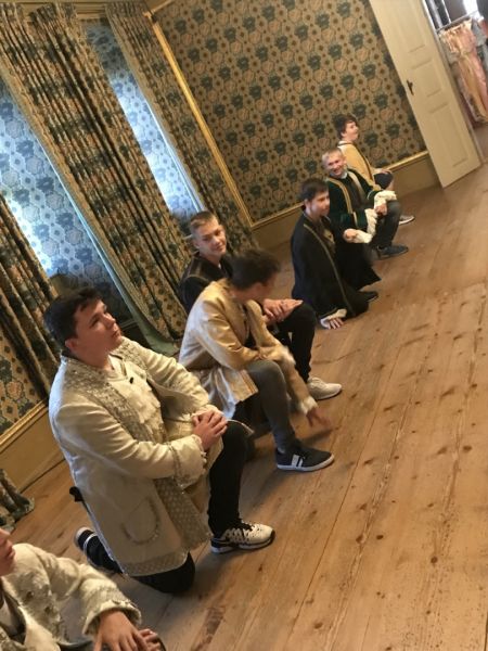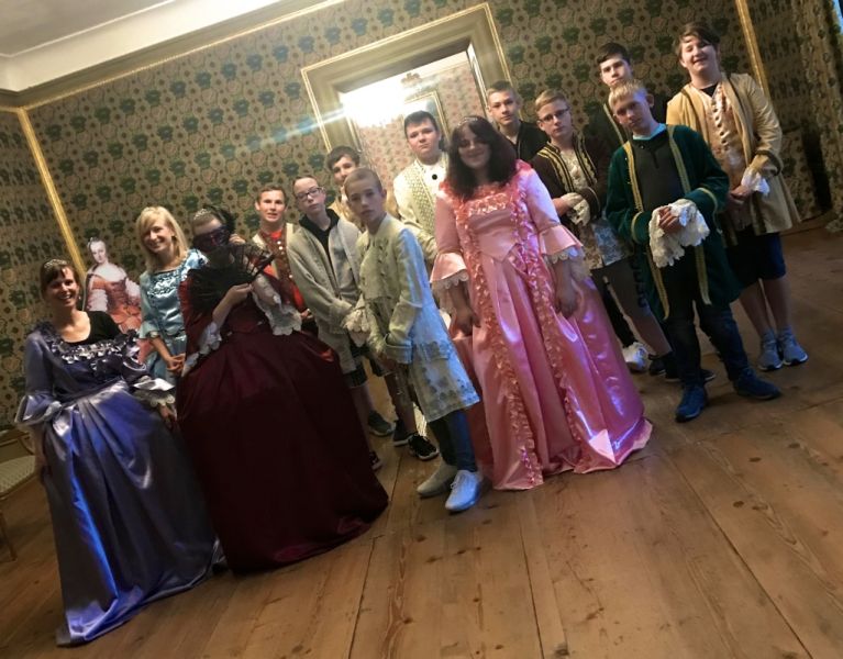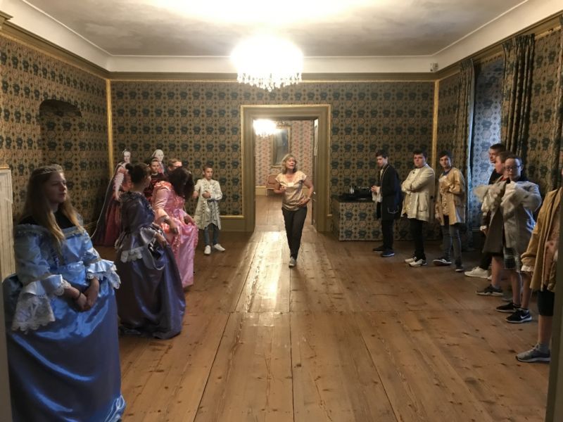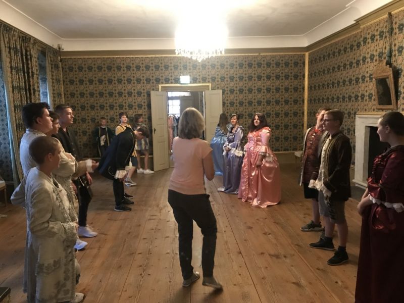 Als erstes haben wir unsere Rucksäcke in die Fächer gepackt. Danach sind wir zu den Kleiderräumen gegangen. Wir durften die Kleider von früher anziehen. Sie waren kratzig und nicht so leicht, wie Kleider von heute. Als wir die Kleider angezogen hatten, haben wir einen Tanz gelernt. Alle sahen komisch aus. Wir durften Fotos machen. Es war lustig.