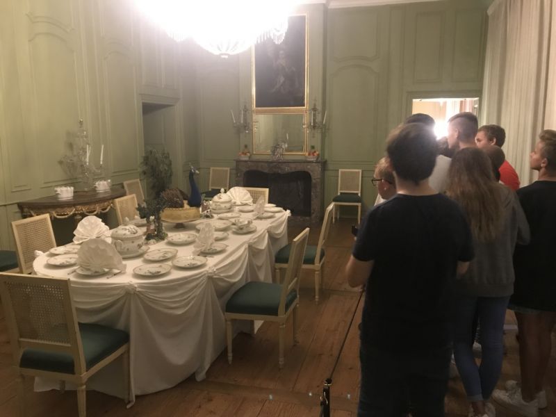 Im Schwetzinger Schloss hatten wir eine Frau als Führerin und sie hatte eine sehr hohe Stimme, aber es ging. Wir durften Kleidung anziehen von früher. Wir haben interessante Geschichten über die Gastgeber im Schloss erfahren, z.B. hat Augusta manchmal grausame Spiele mit Leuten gemacht z.B. Kerze auf die Nase stellen. Danach hat die Frau uns herumgeführt. Als erstes waren wir im Schlafzimmer, anschließend hat sie uns das Esszimmer gezeigt, wo man auch Geburtstage feiern kann. Es gab einen Spieleraum, wo die Leute von früher sich beschäftigen duften, wenn sie auf eine Audienz warteten. Im nächsten Raum war eine Toilette. Die Bediensteten mussten das Geschäft immer wegbringen, denn es gab keine Spülung. Danach haben wir noch das Puderzimmer und die Geheimtüren gesehen. Wenn die Herrscher etwas von den Bediensteten wollten, mussten sie nur mit den Glocken klingeln und die Bediensteten sind dann durch die Geheimgänge gekommen.
