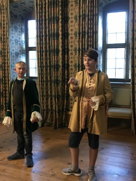 Wir sind von Neckargemünd nach Heidelberg mit dem Zug gefahren und von Heidelberg nach Schwetzingen mit dem Bus. Frau Gralla ist in den Laden gegangen, um die Tickets zu kaufen. Danach sind wir zur Schlossführerin gegangen und ließen uns durch das Schloss führen. Die Führerin hat uns Anzüge und Kleider von früher ausprobieren lassen und wir haben gemeinsam einen Tanz aufgeführt. Nach dem Tanzen sind wir zu Carl Theodor und Elisabeth Augustas Schlafzimmer gegangen. Die beiden waren früher die Herrscher im Schloss. Wir haben dann noch alle anderen Räume gesehen.