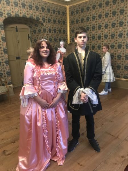 Die Frau, die bei uns im Schwetzinger Schloss war und uns im Schloss herumgeführt hat, war manchmal streng, da sie nicht wollte, dass etwas kaputt geht, wenn man sich z.B. angelehnt hat. Der Ausblick beim Schwetzinger Schloss war sehr schön. Es gab sehr viel zum Anschauen und man durfte Kleider anziehen. Wir haben auch Frau Wagner und Frau Gralla angezogen. Danach haben wir alle einen Tanz gemacht. Anschließend haben sich alle vorgestellt, denn jeder hatte eine Rolle (z.B. Augusta, Carl, die Hofdamen, die Bediensteten, der Knappe...). Nachdem wir alle fertig mit vorstellen und Tanzen waren, haben wir Fotos gemacht und uns dann wieder ausgezogen. Später machten wir einen Rundgang durch das ganze Schwetzinger Schloss. Zum Schluss sind wir noch in den Schlossgarten gegangen und haben ein Picknick gemacht. Der Tag beim Schwetzinger Schloss war sehr toll.