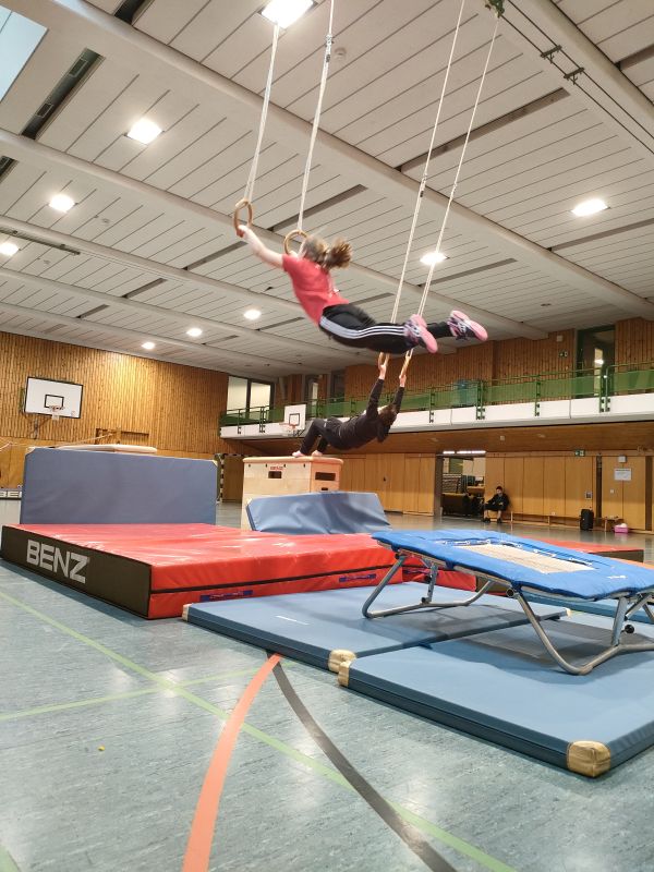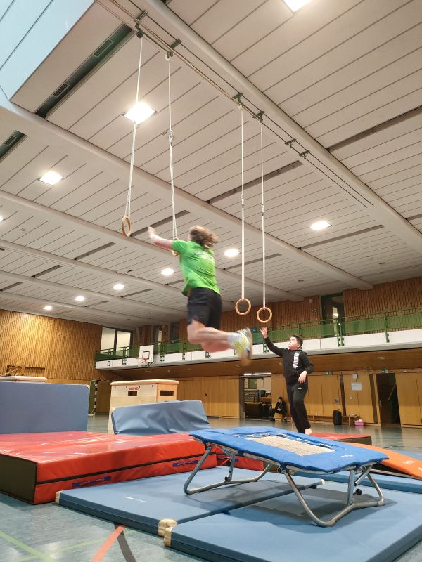 Auf den Bildern ist zu sehen, wie durch das Springen an die Ringe mit Hilfe eines Minitrampolins ein etwas entfernter Kasten erreicht werden soll. Das erfordert Genauigkeit, Griffkraft, Körperspannung, Durchhaltevermögen, einiges an Mut und Selbstvertrauen und natürlich die Freude an der Bewegung.