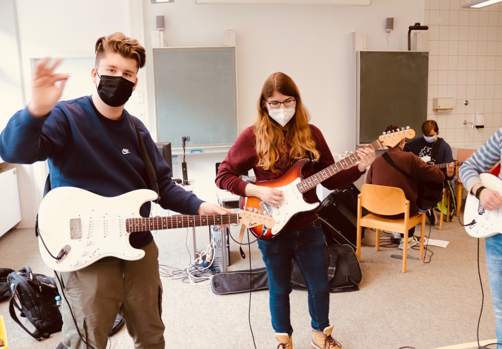 Überall in der Luise konnte man plötzlich Musik hören. Da traf man auf Schülergruppen mit E-Gitarren und Keyboards in den Umkleidekabinen der Sporthalle. Wer am Mehrzweckraum, der Turnhalle, dem Musikraum oder den Klassenzimmern vorbeilief, konnte mit etwas Glück hören, wie die Schüler*innen der Jahrgangsstufe acht und neun gemeinsam mit ihren Coaches gearbeitet haben. Zwei Tage lang probierten sie Bandinstrumente aus, übten Gesang, produzierten Beats und schrieben eigene Songtexte. Für die Schulband der Luise gab es ein extra Schulbandcoaching.