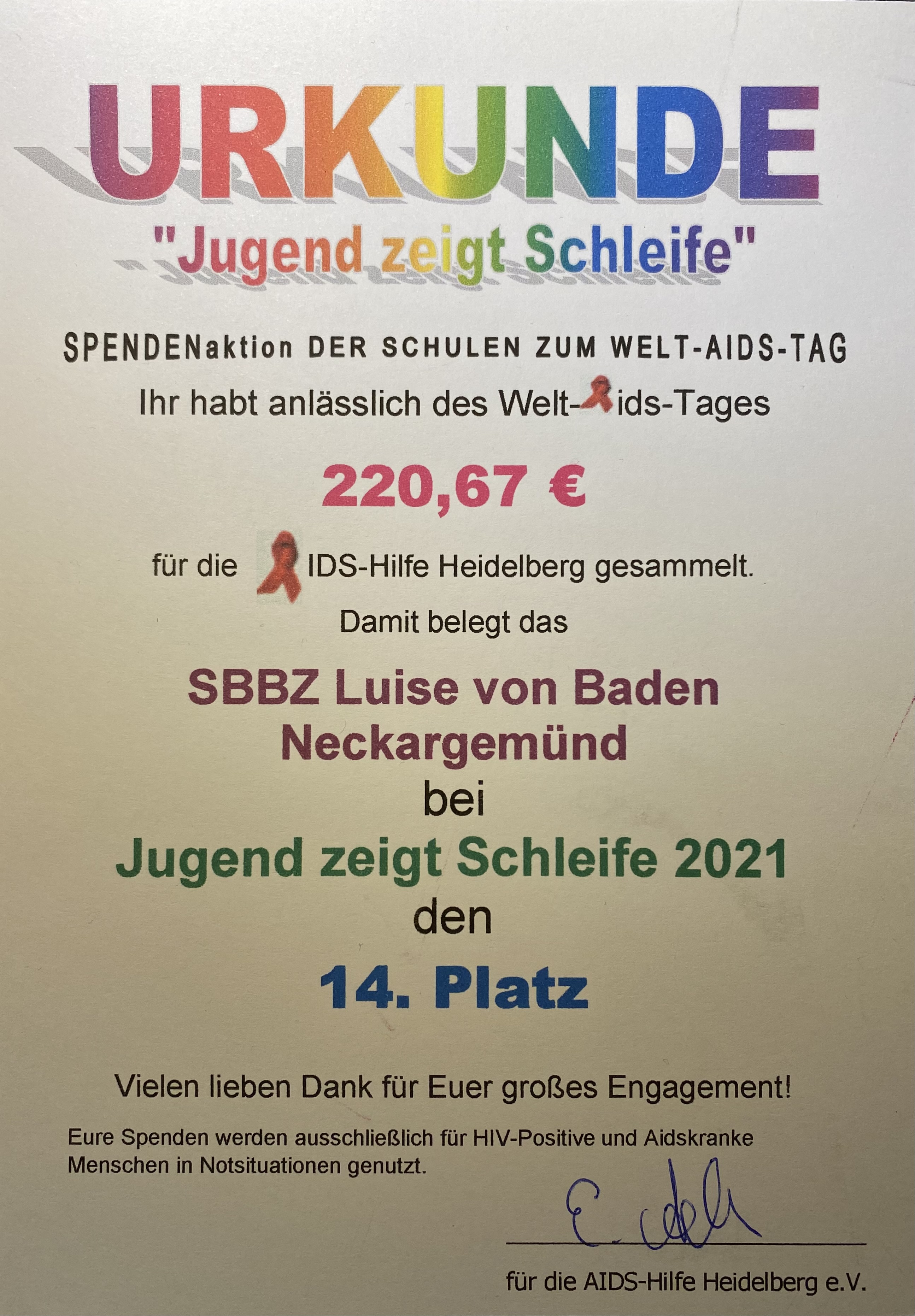 Im Namen der AIDS Hilfe Heidelberg e.V. bedankt sich die SMV bei allen Spenderinnen und Spendern. Die AIDS Hilfe Heidelberg e.V. würde sich freuen, wenn das SBBZ Luise von Baden auch in diesem Jahr wieder an der Spendenaktion teilnehmen würde.
