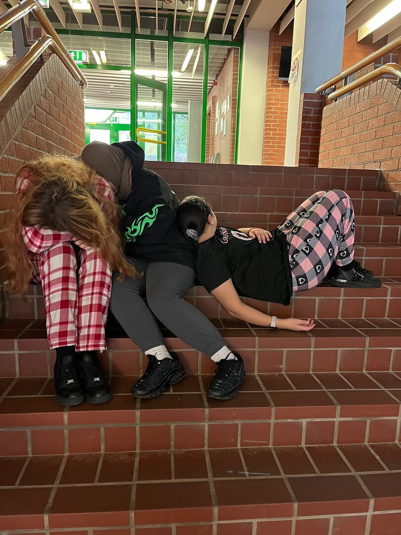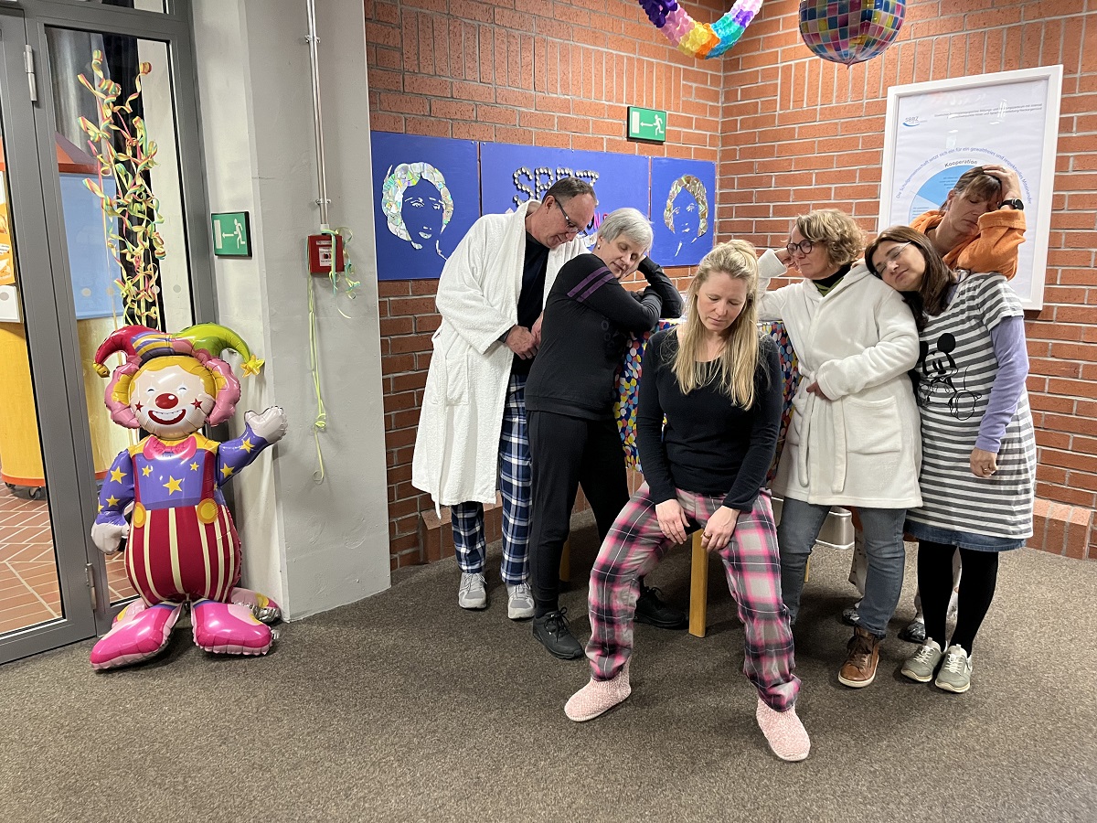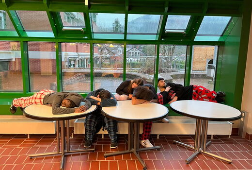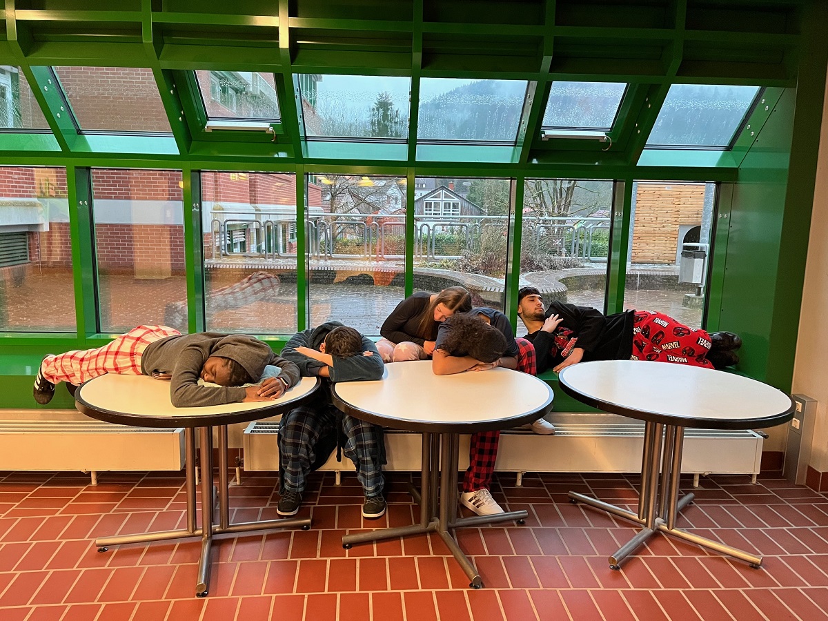 Schließlich ging es am Donnerstag an der gesamten Einrichtung gänzlich verschlafen zu und es kam zu unerhörten Zuständen (siehe Fotobeweise). Der müde Haufen an der Luise kam erst bei der Faschingsparty so richtig in Schwung. Diese wurde von den achten Klassen organisiert. Das Gute war, dass sich kein Mensch Gedanken machen musste über die richtige Kleidung, da sich einfach alle aus dem Bett direkt in die Schule begeben konnten, um sich dann am Nachmittag unverändert in die Federn fallen zu lassen.
