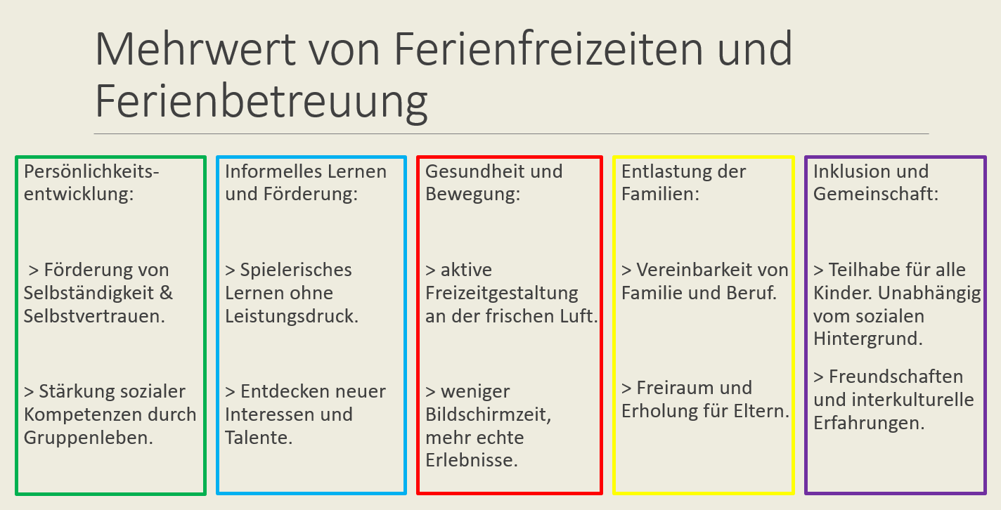 Zahlreiche Ferienprogramme verschiedener Städten und Gemeinden sowie Ferienfreizeiten in Deutschland und im Ausland wurden vorgestellt. Weiterhin wurden mögliche Unterstützungsmöglichkeiten angesprochen. Hierbei empfehlen wir grundsätzlich zu den jeweiligen Anbietern Kontakt aufzunehmen und nachzufragen, welche Finanzierungshilfen bei dem jeweiligen Angebot greifen.
