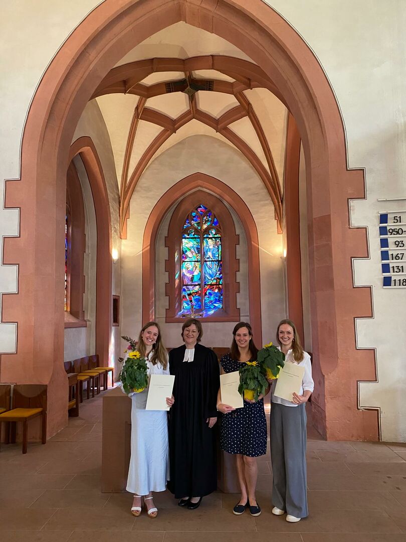 Drei Lehrerinnen der Luise erhielten am Sonntag, den 7. Juli die Vocatio der Evangelischen Landeskirche. Die feierliche Überreichung der Urkunden an Chiara Löhle, Dominique Nossek und Charlotte Vieth (von links nach rechts) durch Schuldekanin Dr. Silke Dangel fand in einem gemeinsam gestalteten Gottesdienst in der St. Ulrichkirche in Neckargemünd statt. Die Vocations-Urkunde berechtigt zur Erteilung von christlichem Religionsunterricht.
