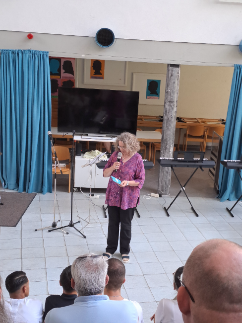 Die Schulleiterin Frau Soerensen bereichterte die SBFW-Feier mit einer inspirierenden Rede zum Thema Menschlichkeit. Sie hob hervor, wie wichtig es sei, in unserer heutigen Gesellschaft menschlich und mitfühlend zu handeln. Die Schülerinnen und Schüler sorgten mit verschiedenen Spielen und Aktivitäten für viel Spaß und Lachen. Ein Highlight war das Spiel "Gesichter erkennen", bei dem das Publikum die vom Schüler Leonardo Kamberowski gezeichneten Bilder von Mitschüler*innen und Lehrkäften durch teilweises Aufdecken erraten mussten. Auch ein Quiz, bei dem das Wissen der Lehrkräfte über die Schüler*innen auf die Probe gestellt wurde, sorgte für gute Stimmung und regte teilweise auch zum Nachdenken an. Musikalisch wurden die Feiern von einem Musikbeitrag des VAB und einem Song, perfomt von Marek Firmanti, untermalt.