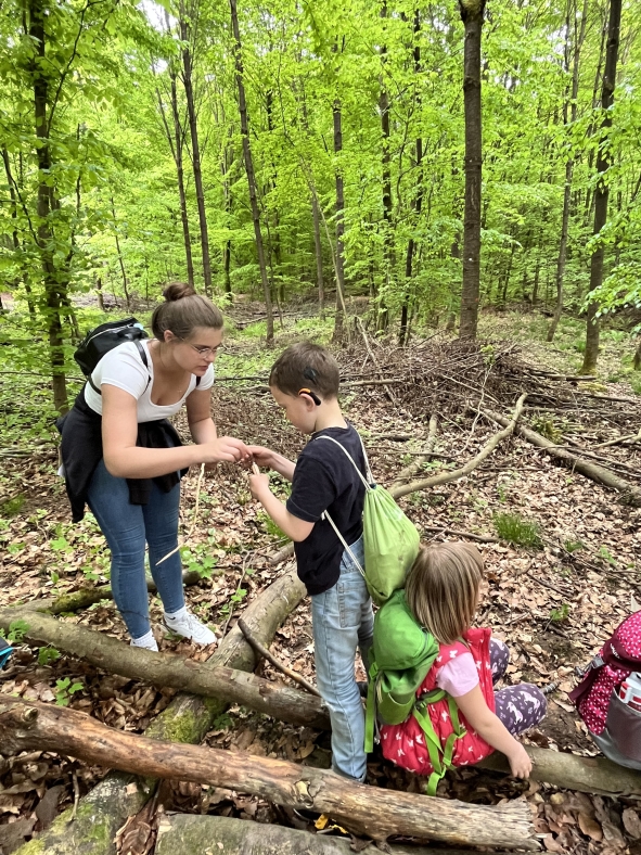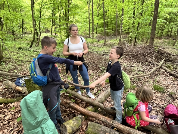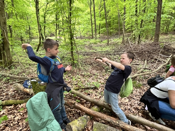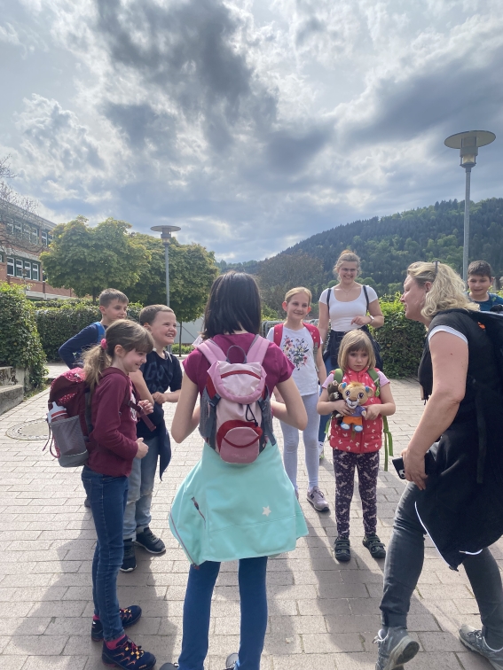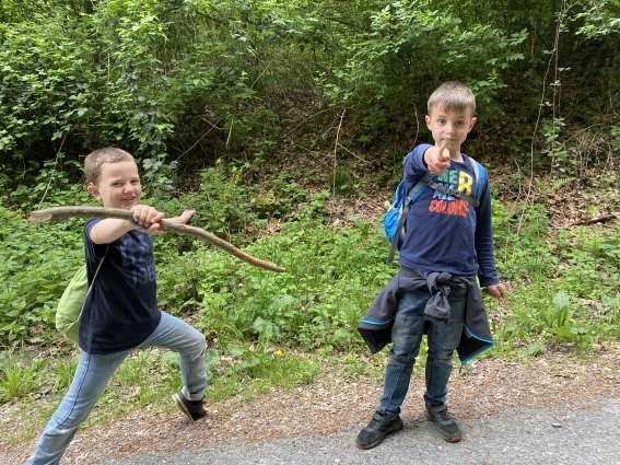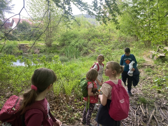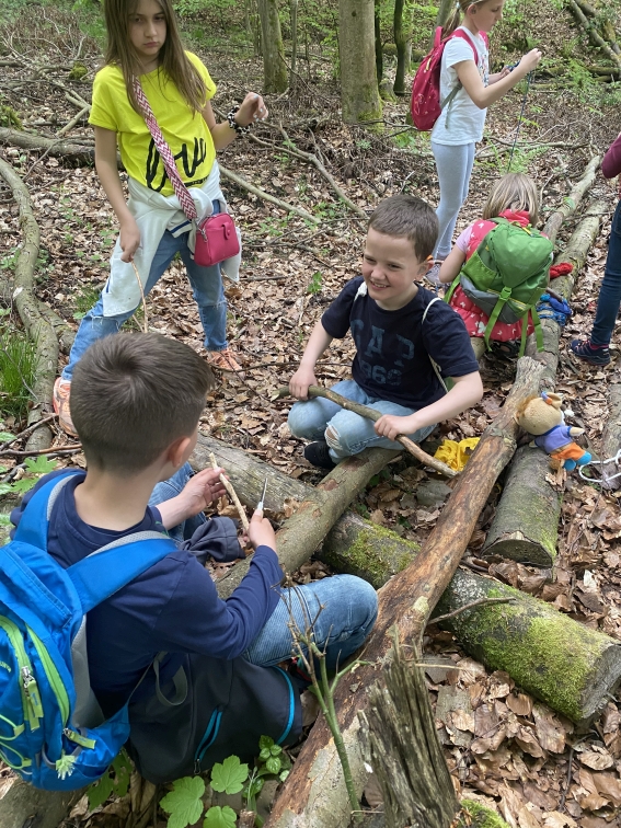 Am ersten Freitag im Mai traf sich ein besonderer Club von Kindern in Neckargemünd. Wir alle freuten uns auf einen zauberhaften Ausflug in den Wald. Bereits bei der Ankunft bemerkten aufmerksame Wetterhexen und Wetterhexer, dass einige Wolken am Himmel doch recht dunkel aussahen. Wir ließen uns nicht beirren und zogen los. Auf dem Weg bewunderten wir zahlreiche Heil- und Giftpflanzen und tauschten Rezepte und Erfahrungen aus.  Egal ob Holunder- Fichten- oder Buchenholz:  jede und jeder fand auf dem Weg einen gut passenden Zauberstab. An einem malerischen Platz im Walde ließen wir uns nieder und bearbeiteten unsere Zauberstäbe. Es wurde geschnitzt, gewickelt und geklebt, sodass jeder Zauberstab unverwechselbar und einzigartig zu seinem Besitzer passte. Nach getaner Arbeit versammelten wir uns an einem kleinen Teich und lauschten einer Stelle aus dem Standardwerk für Hexen und Zauberer: „Harry Potter“.  Wir erfuhren, wie Hexen und Zauberer in Hogwarts sich ihren tiefen Ängsten stellen. Und da wir nun auch alle über einen Zauberstab verfügten, probierten wir es auch für uns selbst aus. Mit Zauberspruch  und Zauberstab wurde so mancher Baum, der vorübergehend als Mathearbeit herhalten musste, in unserer Phantasie zu einer Witzfigur.