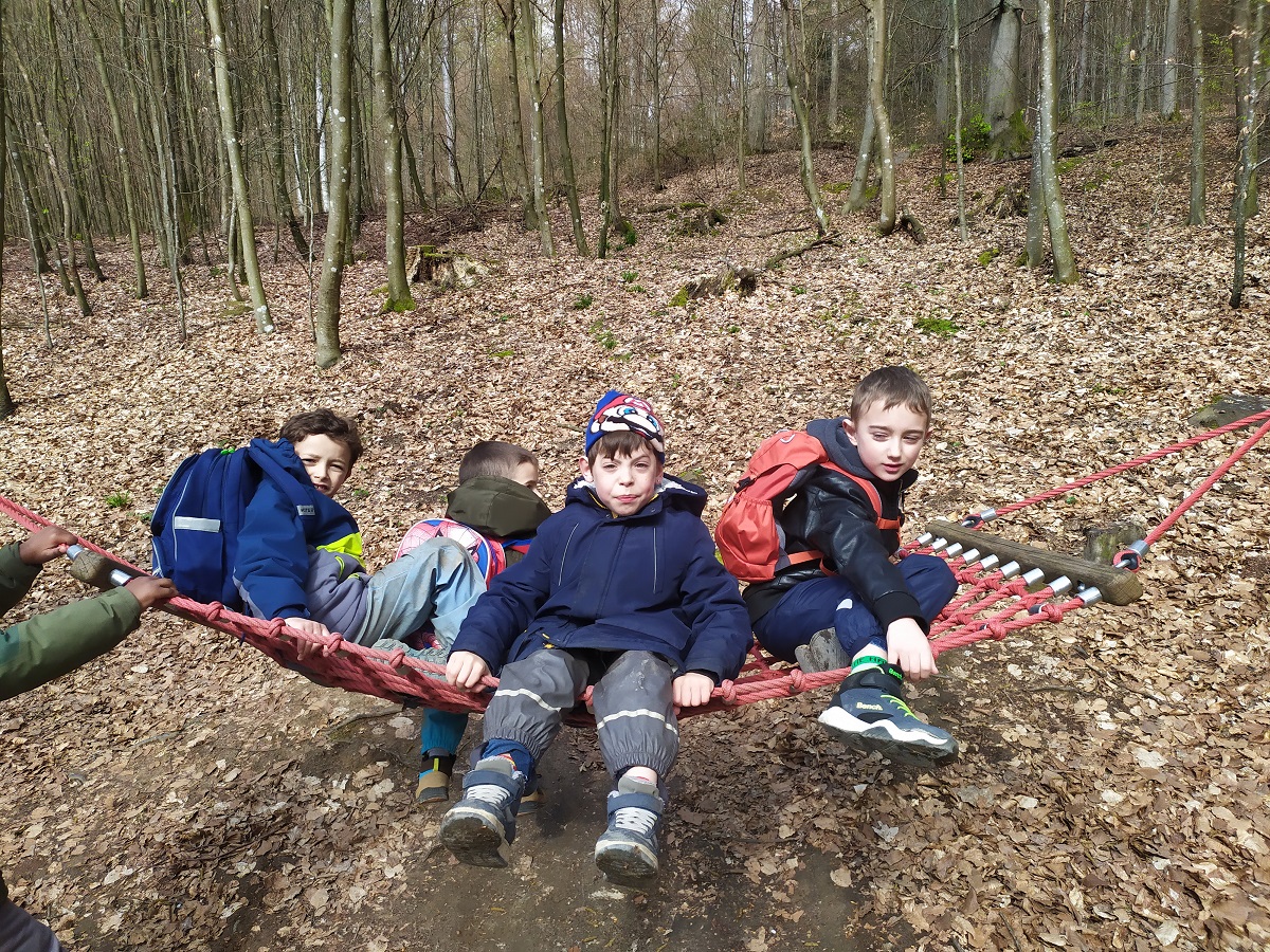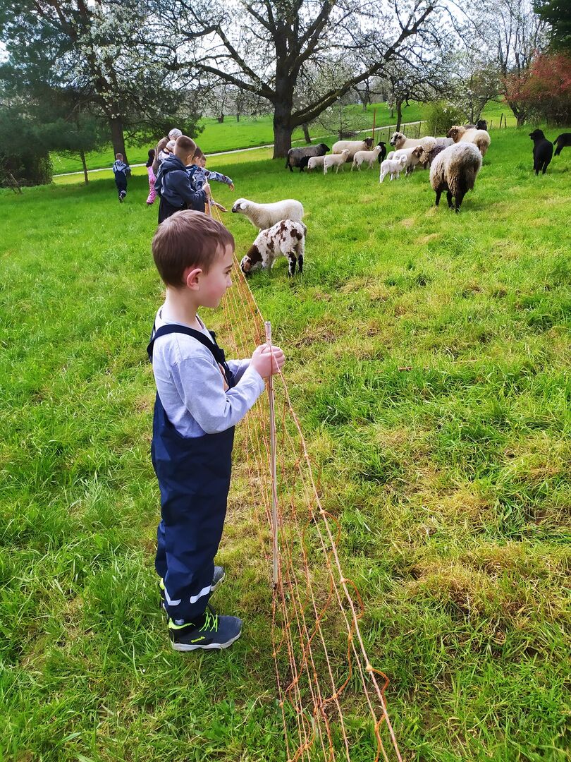 Lange hatten wir uns schon darauf gefreut und am 20. April war es endlich so weit: wir besuchten die Schafe von Frau Gaspers-Jacob in Waldhilsbach. In warmen Jacken, festen Schuhen und voll gepackten Rucksäcken wurde es uns beim Aufstieg in den Wald schnell warm. Da kamen die lange Bank und etwas später die Hängematten auf dem Sinnenpfad wie gerufen. Später gab es auf dem Weg noch mehr zu entdecken: wir hörten einen Specht, ließen Klanghölzer klingen, den Summstein summen, hüpften über Baumstämme und wanderten an einem Pony vorbei. Nachdem wir Waldhilsbach durchquert hatten, erreichten wir endlich die grüne Wiese von Frau Gaspers-Jacob. Sie begrüßte uns und wir machten zunächst ein kleines Picknick. Dann ging es weiter auf die Weide. Doch wo waren die Schafe? Wir konnten nur weit entfernte Wollknäuel entdecken. Frau Gaspers-Jacob rief ein paar Mal laut und da kamen sie schon angerannt: helle, dunkle, gefleckte Schafe und auch viele Lämmer. Wir durften einige streicheln und spürten wie unterschiedlich sich die Wolle anfühlte. Natürlich hatten wir auch viele Fragen an Frau Gaspers-Jacob, die sie uns geduldig beantwortete: Was fressen die Schafe im Winter? Wie viele Schafe sind es? Haben die Schafe Namen? Zum Schluss durften wir die Schafe sogar noch auf eine neue Weide führen mit viel frischem, saftigem Gras. Es hat uns sehr gut gefallen und wir kommen sicher gerne nächstes Jahr wieder!