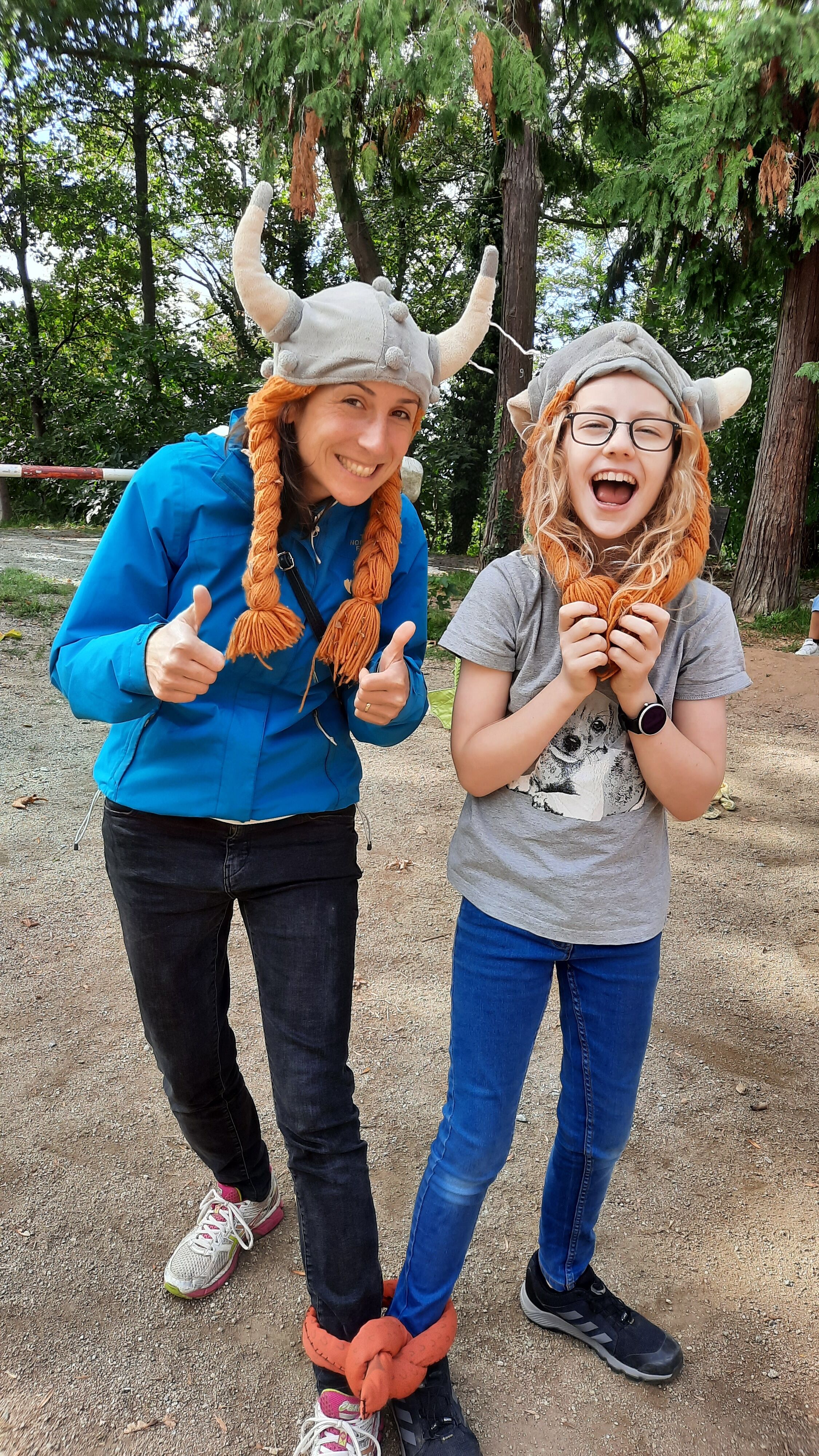 - wir ein Schlangenrennen mit lustigen Kopfbedeckungen gemacht haben.