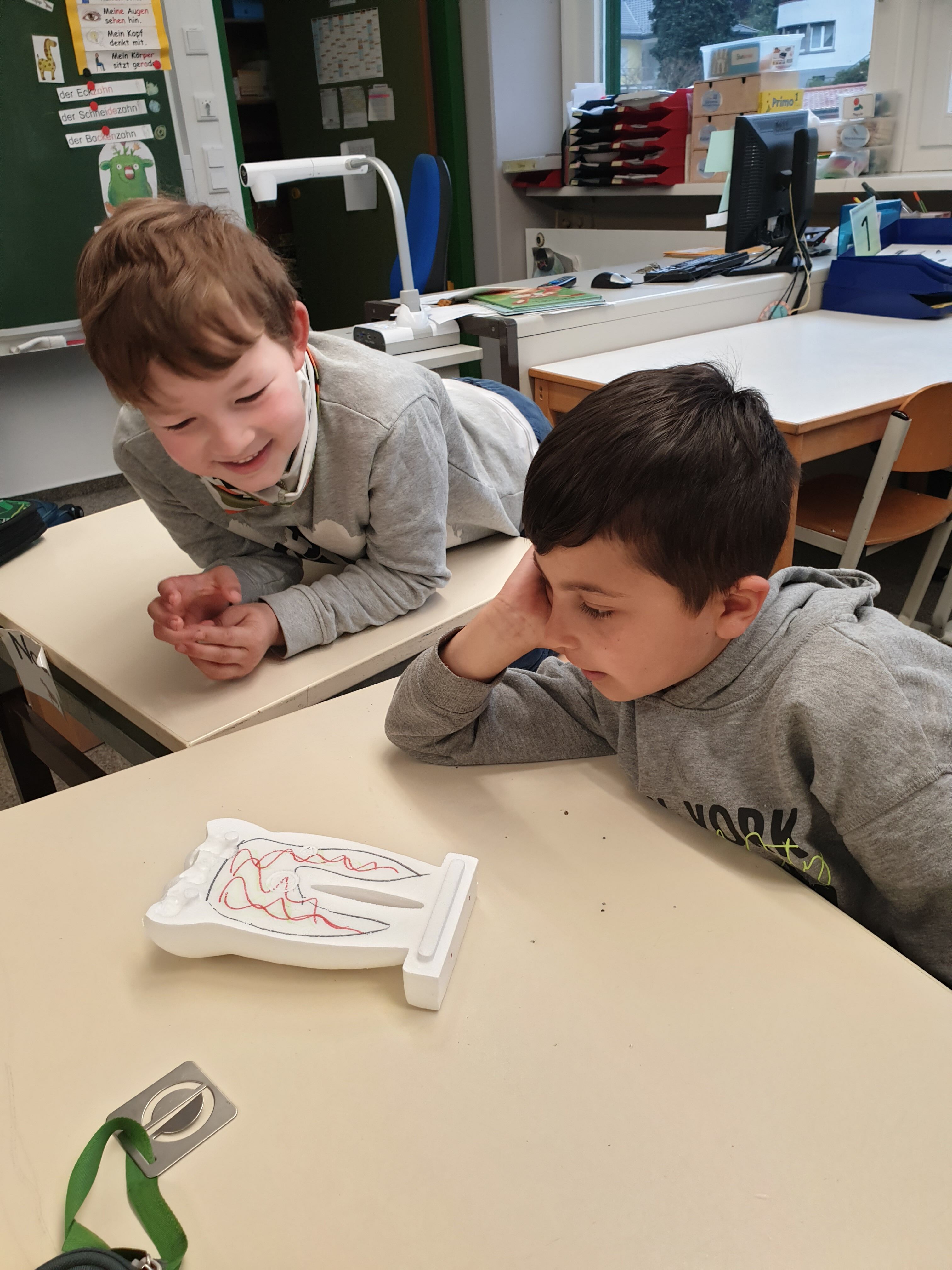 Frau Kappes zeigte den Erstklässlern, wie sie ihre Zähne richtig reinigen und brachte ihnen dazu auch einen Reim bei. Anschließend konnten die SchülerInnen an einem Modell sehen, wie die Kariesbakterien einen Zahn kaputt machen können. Das war wirklich sehr eindrücklich!