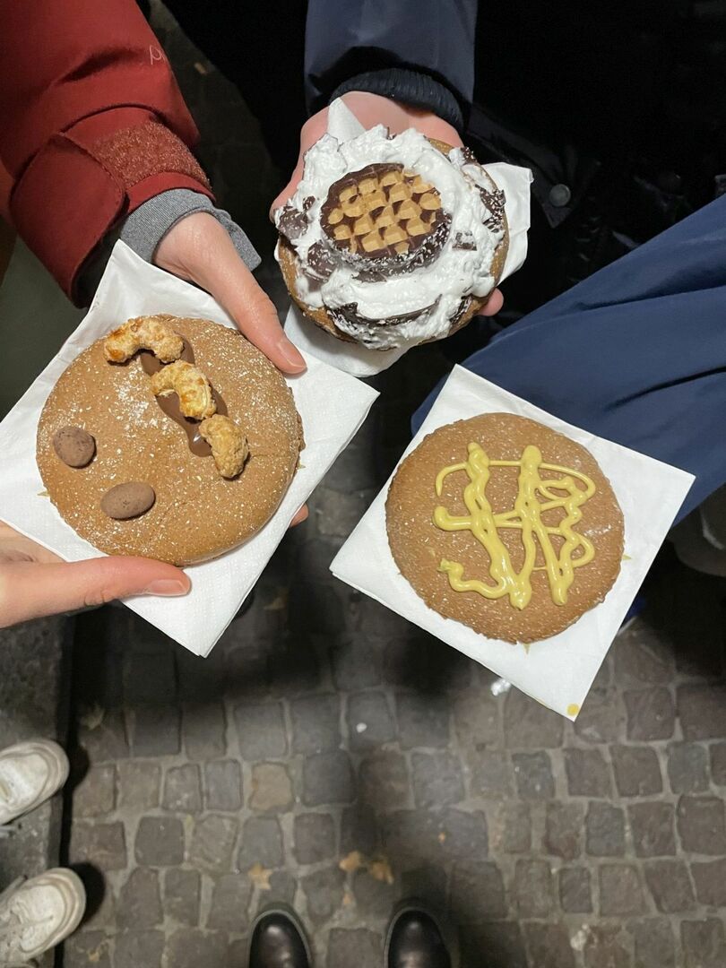 Es gab aber auch kreative Aufgaben. Ein Highlight des Abends war die Lebkuchen-Challenge. Die Aufgabe bestand darin, ein Lebkuchengebäck an den Weihnachtsständen mit verschiedenen Zutaten zu dekorieren. Es entstanden dabei die kreativsten Kreationen mit einem Schokokuss als Schnee auf dem Lebkuchen, einem Smiley aus Schokokugeln-Augen, einem Popcorn Mund und einer ganz anderen Art der Dekoration mit einer Senf-Verzierung auf dem Lebkuchengebäck.