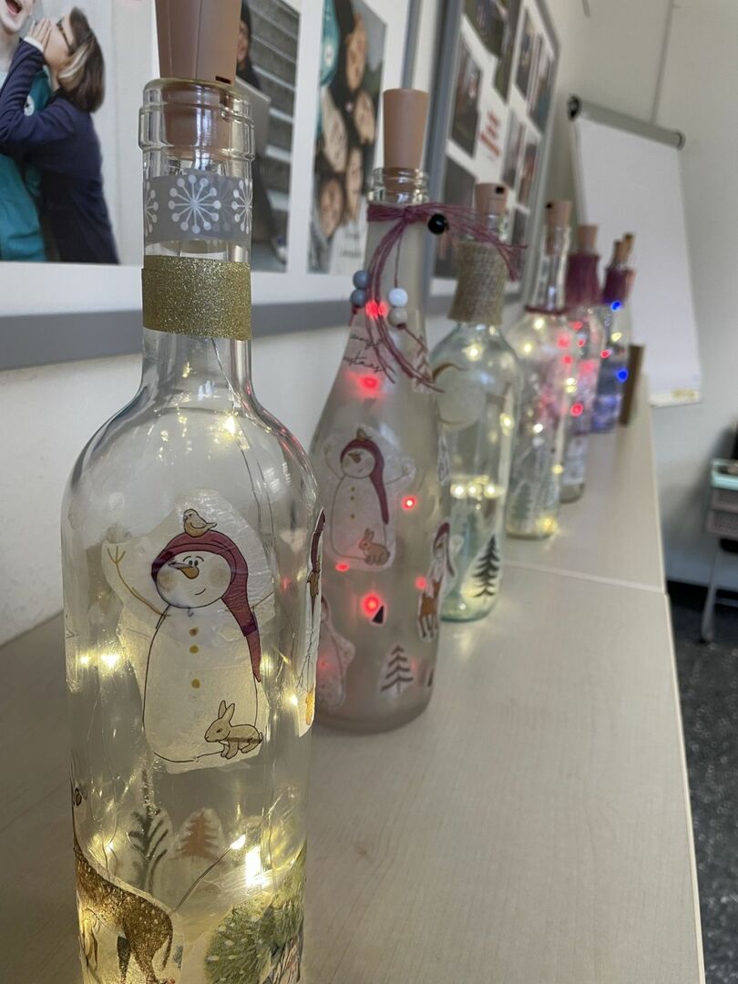 Am nächsten Morgen trafen wir uns zu kreativen Back- und Bastelangeboten. Hier kneteten die Lamas Teig, stachen Plätzchen aus und verzierten diese mit Streuseln und bunten Leckereien. Parallel dazu konnten sie stimmungsvolle Flaschenlampen mit Serviettentechnik und einer integrierten Lichterkette gestalten und Weihnachtskarten nach eigenen Vorstellungen basteln. Mit der Serviettentechnik kreierten die Lamas wunderschöne Motive wie Sterne, Schneeflocken und Weihnachtsbäume und das Innere der Flasche wurde mit einer Lichterkette ausgefüllt – hier wurde jede Flasche zu einem einzigartigen Unikat. Ein Angebot, das sowohl die motorische als auch die kreativen Fähigkeiten förderte – alle hatten sichtlich Spaß und waren stolz auf ihre Werke. Die gebackenen und gebastelten Schätze durften natürlich mit nach Hause genommen werden, um die Vorweihnachtszeit zu versüßen.