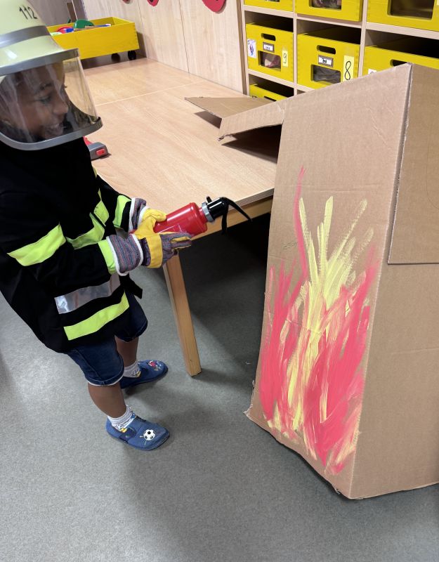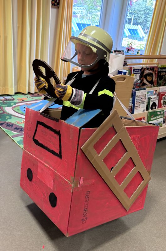 Später auch ein „Brand“ im Spielkartonhaus: zuerst wurde die Feuerwehrausrüstung angezogen, dann unter 112 der Notruf gewählt! Als geklärt wurde, wo sich der Brand befindet, eilten die Feuerwehrkinder mit dem Feuerwehrauto zum Brand. Unter vollem Einsatz wurde gelöscht, befreit und sogar Menschen aus dem Feuer gezogen und gerettet! Nach so einer Vorbereitung kann der Besuch bei der „richtigen“ Feuerwehr kommen.