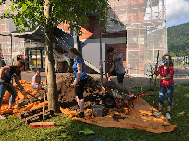 Zur Vorbereitung hatten wir im Mathematikunterricht die Beete ausgemessen und ausgerechnet, wie viel Erde wir benötigen. Am Dienstagmorgen gegen 9 Uhr lieferte uns die Stadt Neckargemünd 1,2 Kubikmeter Erde. Wir mussten Schaufeln und Eimer mit in den Schulgarten nehmen, um die Erde transportieren zu können. Im Schulgarten hatten wir die Eimer, große Schaufeln, kleine Handschaufeln, Rechen und eine Schubkarre zum Arbeiten.