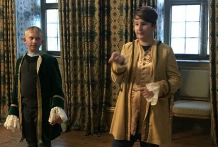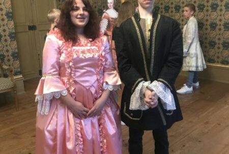 Wir sind von Neckargemünd nach Heidelberg mit dem Zug gefahren und von Heidelberg nach Schwetzingen mit dem Bus. Frau Gralla ist in den Laden gegangen, um die Tickets zu kaufen. Danach sind wir zur Schlossführerin gegangen und ließen uns durch das Schloss führen. Die Führerin hat uns Anzüge und Kleider von früher ausprobieren lassen und wir haben gemeinsam einen Tanz aufgeführt. Nach dem Tanzen sind wir zu Carl Theodor und Elisabeth Augustas Schlafzimmer gegangen. Die beiden waren früher die Herrscher im Schloss. Wir haben dann noch alle anderen Räume gesehen.