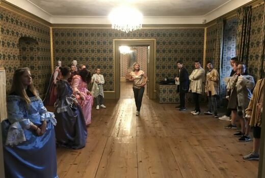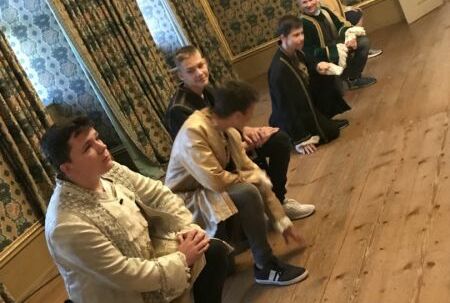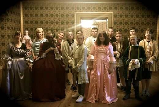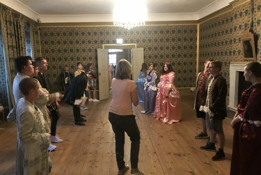 Als erstes haben wir unsere Rucksäcke in die Fächer gepackt. Danach sind wir zu den Kleiderräumen gegangen. Wir durften die Kleider von früher anziehen. Sie waren kratzig und nicht so leicht, wie Kleider von heute. Als wir die Kleider angezogen hatten, haben wir einen Tanz gelernt. Alle sahen komisch aus. Wir durften Fotos machen. Es war lustig.