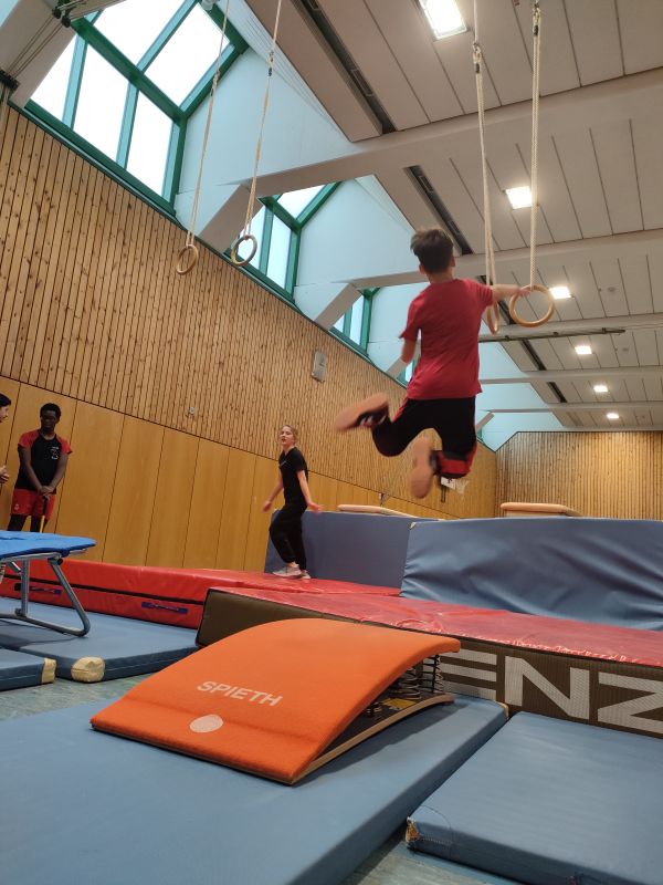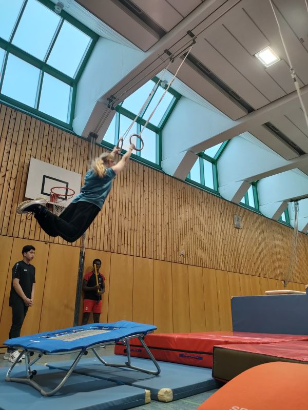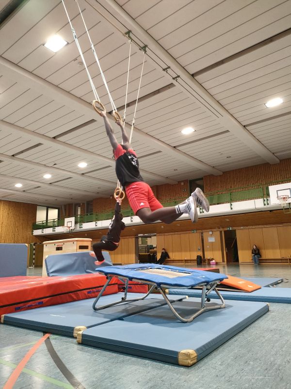 Auf den Bildern ist zu sehen, wie durch das Springen an die Ringe mit Hilfe eines Minitrampolins ein etwas entfernter Kasten erreicht werden soll. Das erfordert Genauigkeit, Griffkraft, Körperspannung, Durchhaltevermögen, einiges an Mut und Selbstvertrauen und natürlich die Freude an der Bewegung.