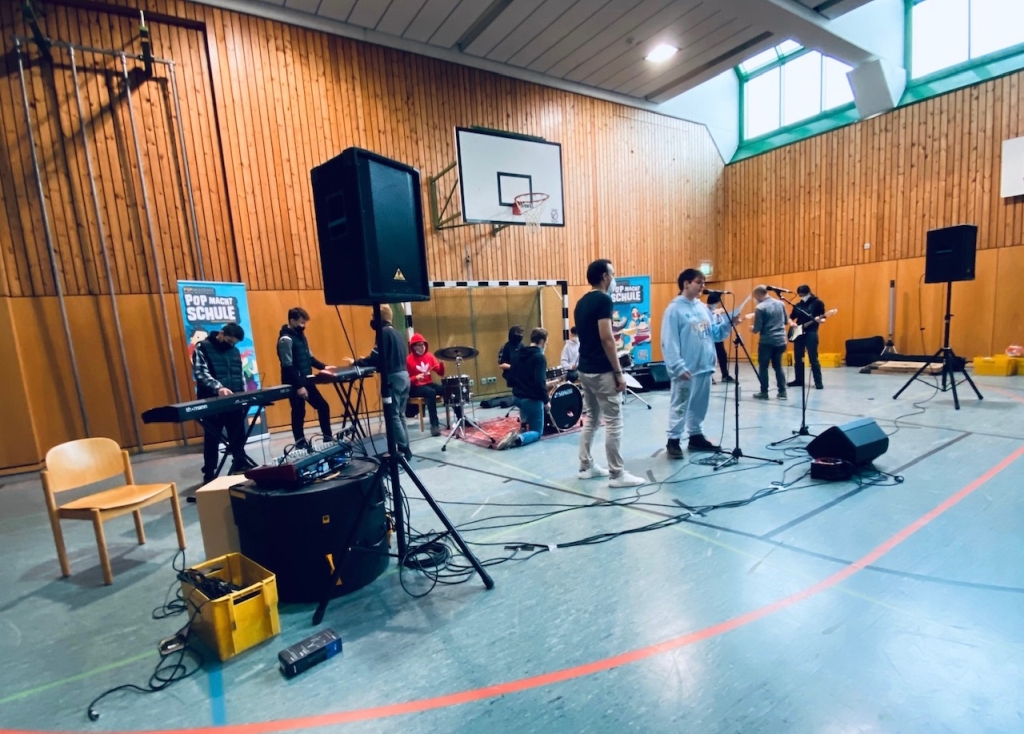 Schon morgens halfen die Schüler*innen beim Ausladen und Aufbauen. Dann ging es richtig los: Die Studenten der Popakademie spielten erst einmal ein Livekonzert für die Schüler*innen!