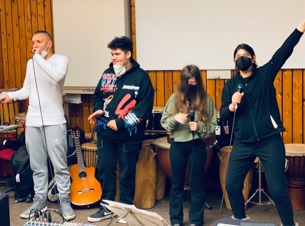 Überall in der Luise konnte man plötzlich Musik hören. Da traf man auf Schülergruppen mit E-Gitarren und Keyboards in den Umkleidekabinen der Sporthalle. Wer am Mehrzweckraum, der Turnhalle, dem Musikraum oder den Klassenzimmern vorbeilief, konnte mit etwas Glück hören, wie die Schüler*innen der Jahrgangsstufe acht und neun gemeinsam mit ihren Coaches gearbeitet haben. Zwei Tage lang probierten sie Bandinstrumente aus, übten Gesang, produzierten Beats und schrieben eigene Songtexte. Für die Schulband der Luise gab es ein extra Schulbandcoaching.